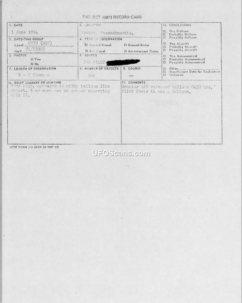 Project 10073 Record Card — Sighting Report, Boston, Massachusetts, 1 June 1954