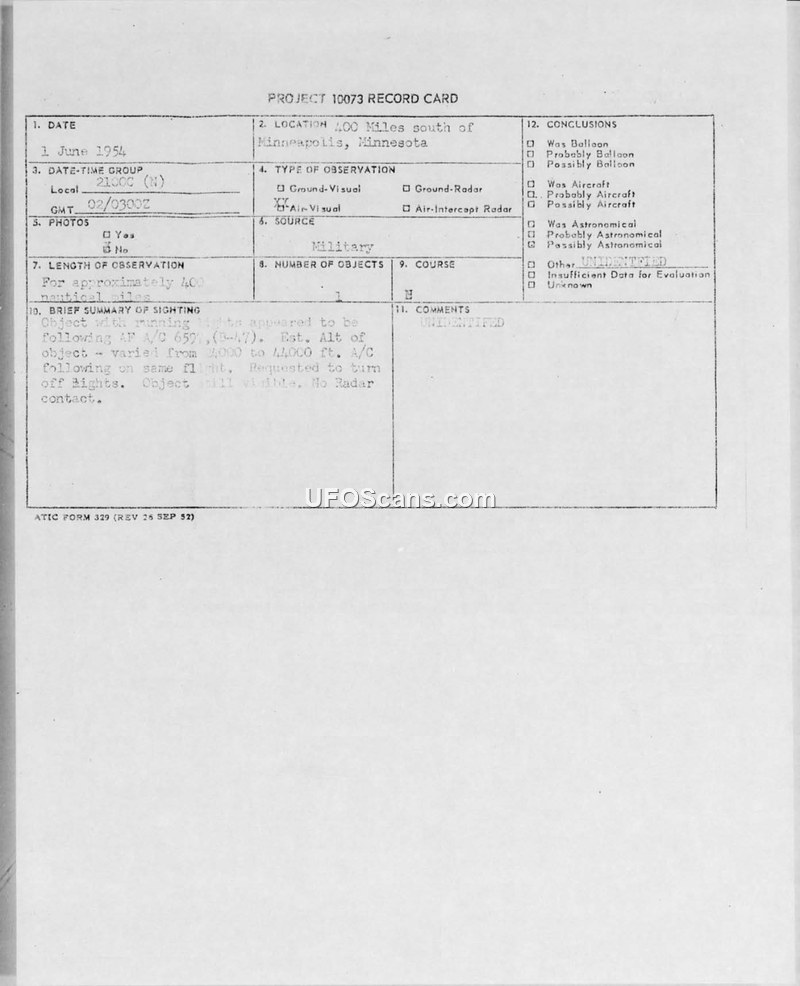 Project 10073 Record Card — Sighting 400 Miles South of Minneapolis, Minnesota