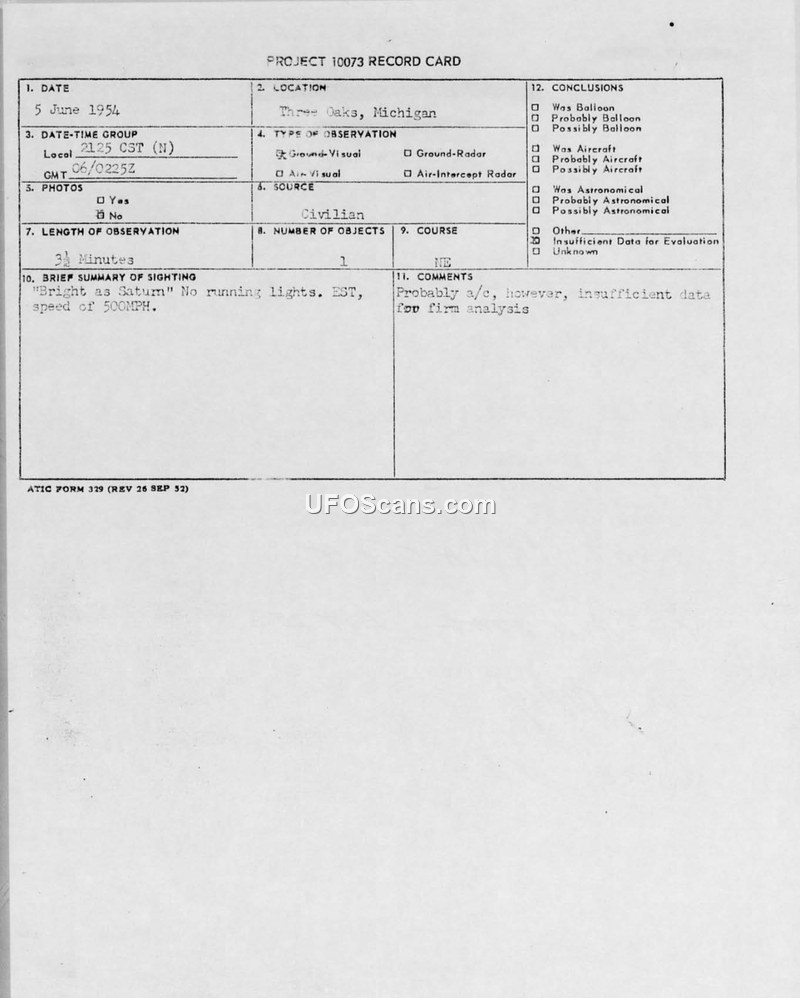 PROJECT 10073 RECORD CARD — Three Oaks, Michigan, 5 June 1954