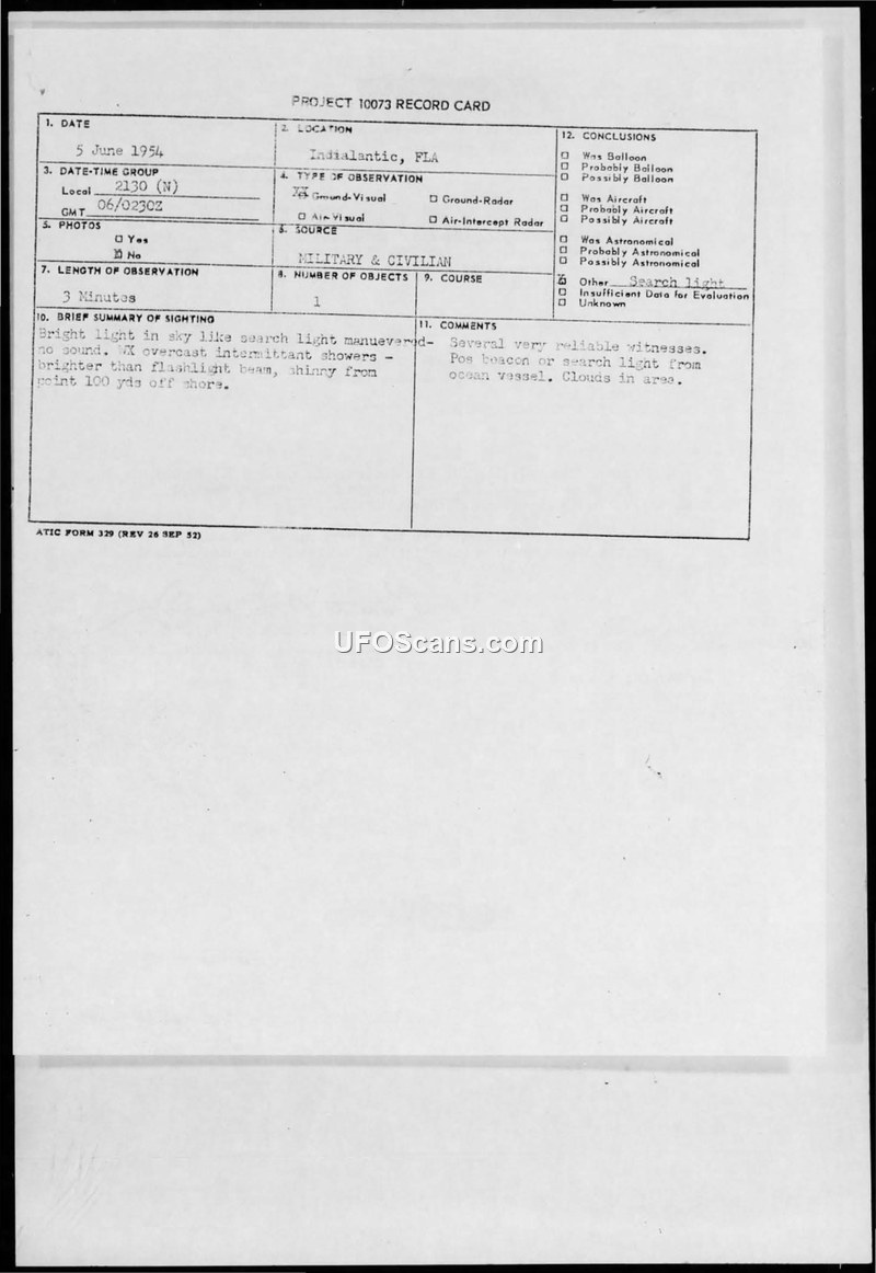This document details multiple 1954 UFO sightings near Patrick Air Force Base, Florida, which were officially attributed to searchlights from ocean vessels. The reports include detailed witness accounts from military personnel and weather data from the period.