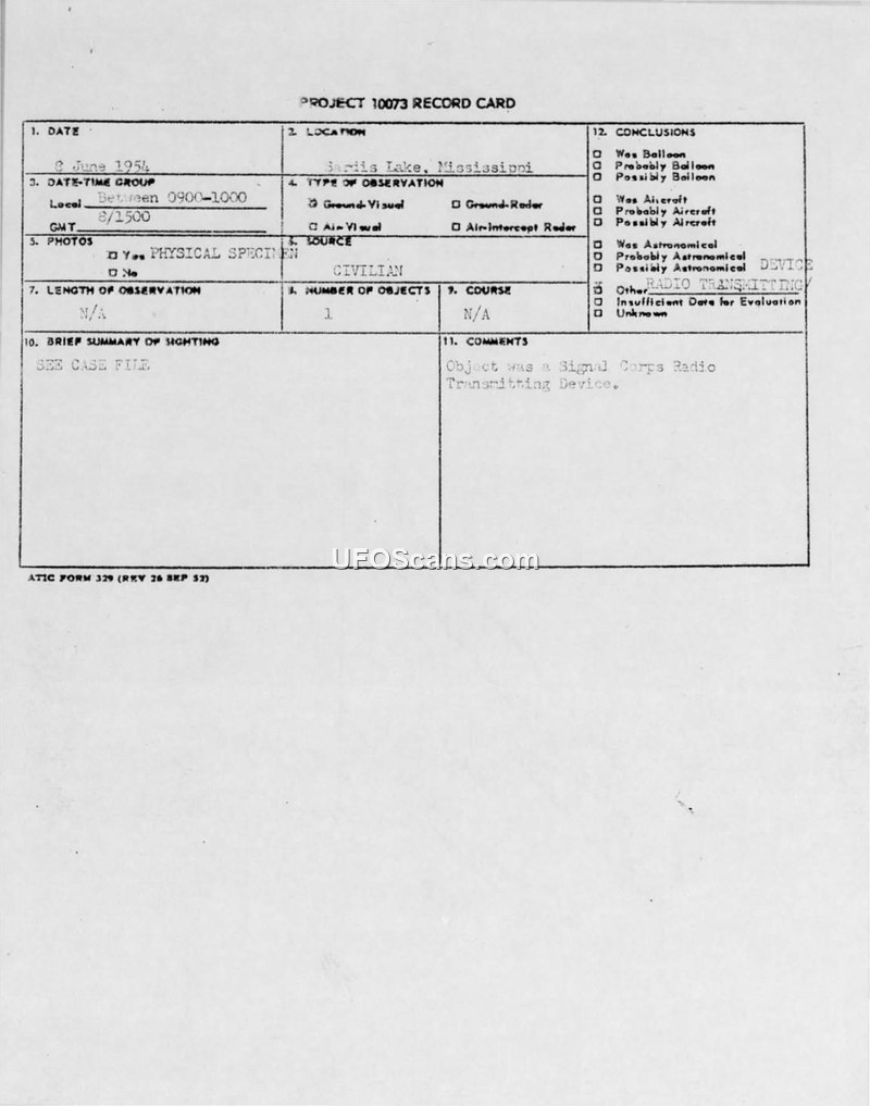 Project 10073 Record Card — Sardis Lake, Mississippi, 8 June 1954