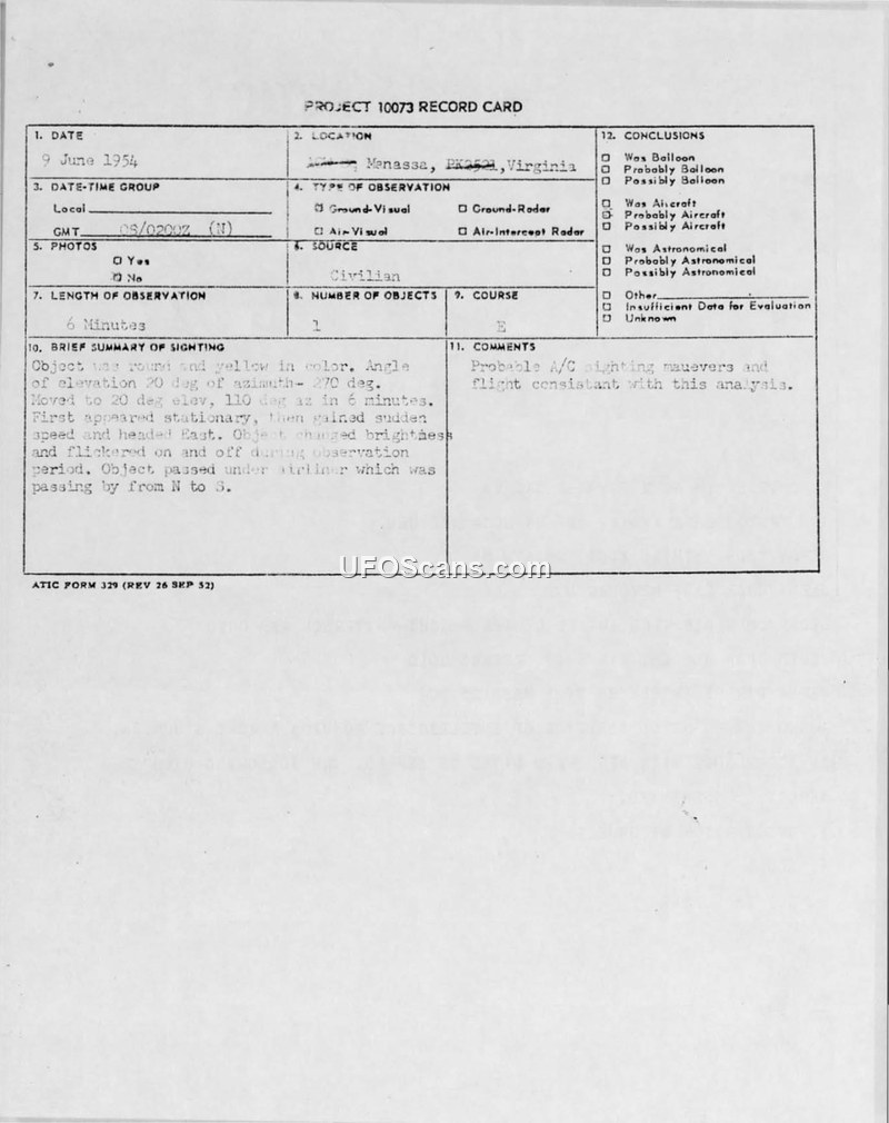 A 1954 sighting report from Manassas, Virginia, describes a round, yellow object that appeared to maneuver near an airliner. The official conclusion lists the cause as unknown due to the object's sudden disappearance.