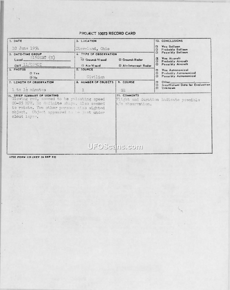 The report documents two separate sightings in Cleveland, Ohio. The first, on 10 June 1954, involved a pulsating, glowing-red object moving at 80-85 MPH. The second, on 22 June 1954, described a cigar-shaped object that emitted an odor of burning sulphur. The Air Force concluded there was insufficient data for evaluation.