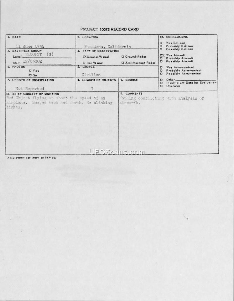 Project 10073 Record Card — Pasadena, California, 11 June 1954