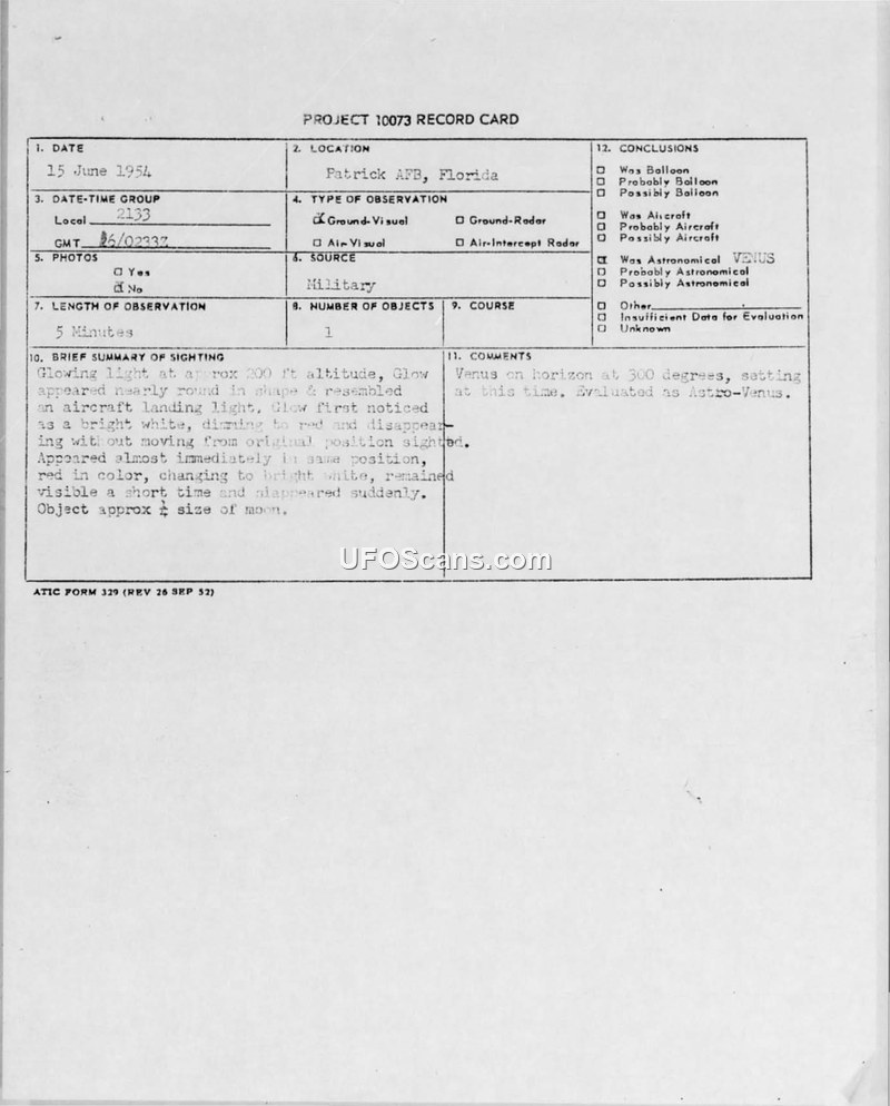 Project 10073 Record Cards and Related Correspondence — Patrick AFB, Florida, June 1954