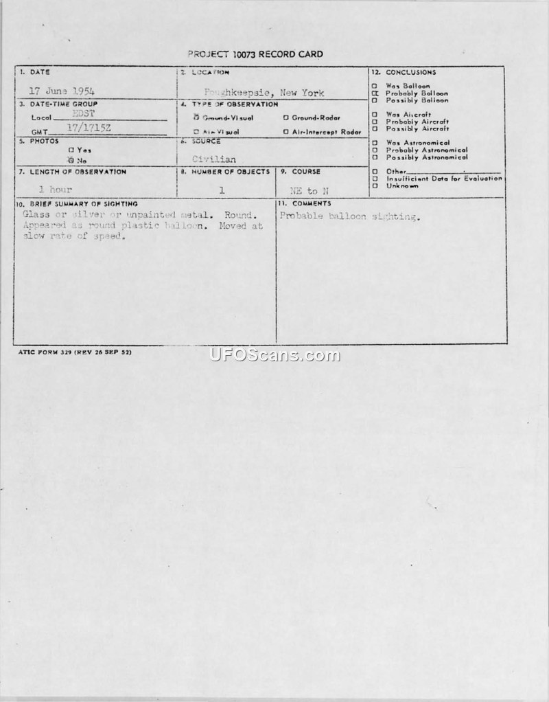 Project 10073 Record Card — Poughkeepsie, New York, 17 June 1954