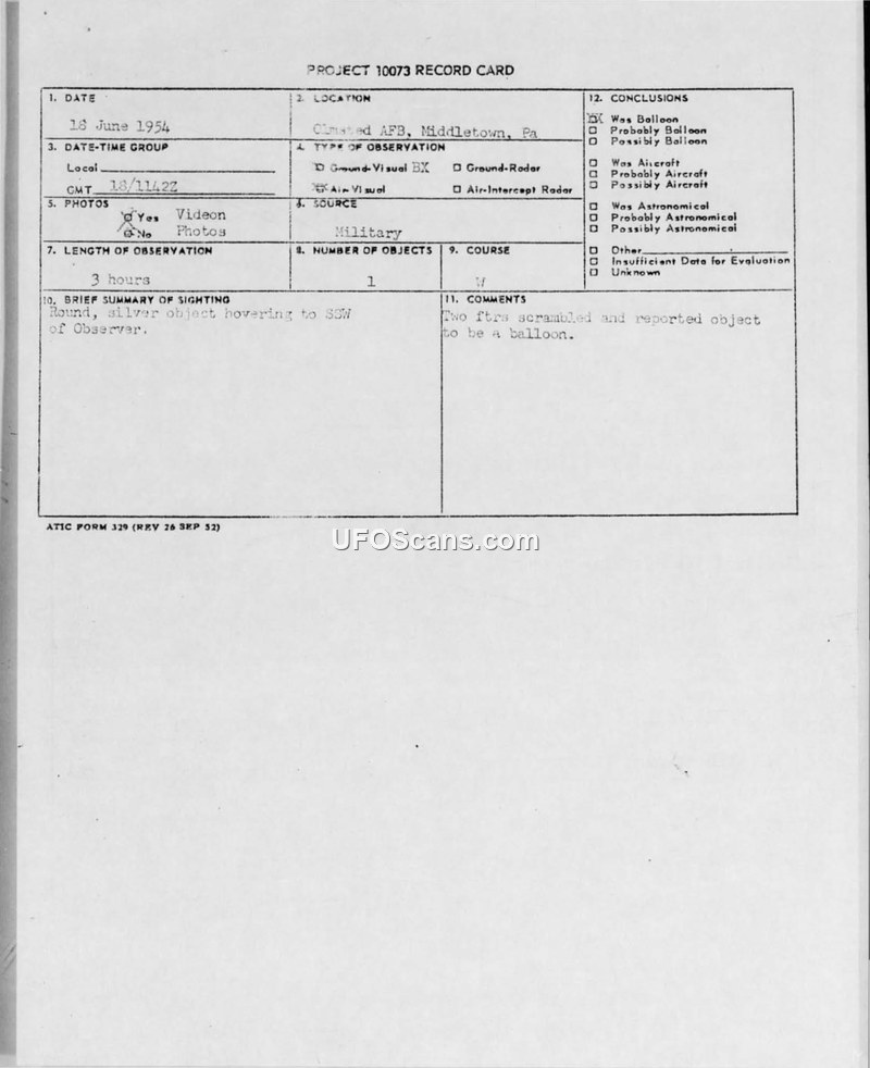 On 18 June 1954, at 0742 hours, personnel at Olmsted Air Force Base in Middletown, Pennsylvania, observed a round, silver object hovering in the sky. The sighting lasted for approximately three hours. The witnesses, including the Chief Aircraft Dispatcher and a Security Indoctrination Officer, described the object as round, silver, and appearing to have a string hanging from its bottom. The object was observed to be hovering and then moving very slowly in a westerly direction before eventually fading away into the distance to the southwest. The observers noted that the object was below the cloud layer, which was estimated at 31,000 feet. No sound was reported, and the object was described as having sharp edges and a transparent appearance. The witnesses used binoculars to observe the object and also captured photographs using a vidion camera. Base operations were notified, and two fighter aircraft were scrambled to investigate the sighting. However, the consensus among the observers and the reporting personnel was that the object was a balloon, possibly an astronomical balloon. The report includes a technical information sheet, a summary of the event, and a formal record card. The documentation confirms that no physical evidence was recovered and that there was no radar contact associated with the object. The report was forwarded to the Air Technical Intelligence Center at Wright-Patterson Air Force Base for further evaluation, along with the exposed film taken during the incident.