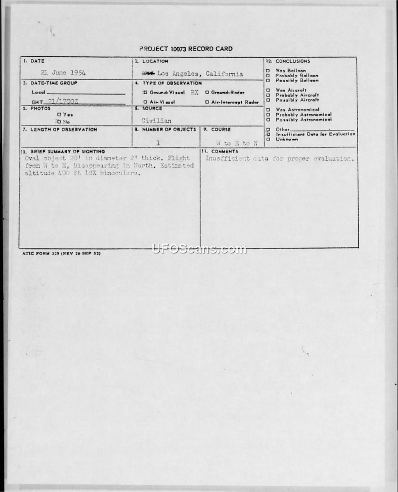 A civilian in Los Angeles reported an oval-shaped object on June 21, 1954. Military intelligence concluded there was insufficient data to evaluate the sighting.