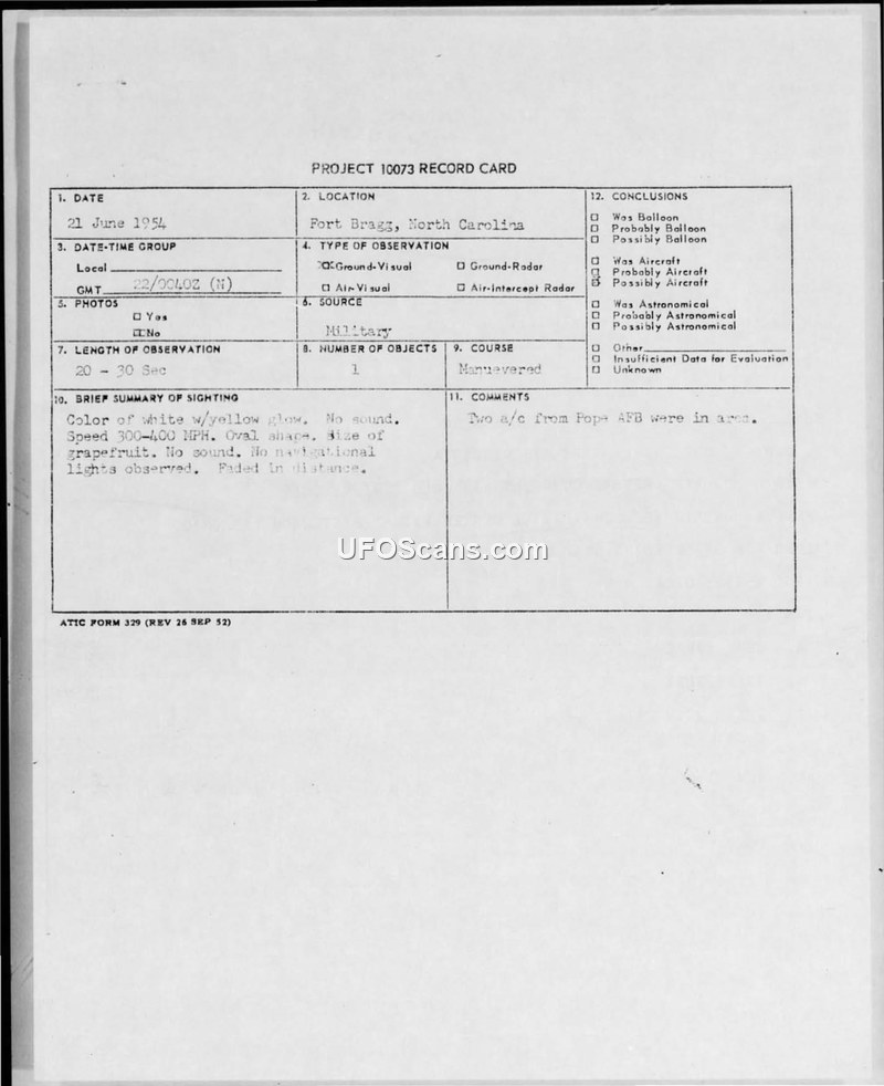 This document is a Project 10073 record card and associated teletype correspondence regarding an unidentified aerial phenomenon observed on 21 June 1954 at Fort Bragg, North Carolina. The sighting occurred at approximately 0040Z. The witness reported a single, oval-shaped object, described as having the size of a grapefruit and emitting a white light with a yellow glow. The object was observed for 20 to 30 seconds. According to the report, the object was first sighted at an altitude of approximately 6,000 feet. It performed a rapid descent to 3,000 feet, where it leveled off and maintained level flight for approximately two miles. Subsequently, the object executed a 90-degree turn to the left before disappearing into the distance. The witness reported that the object made no sound and displayed no navigation lights. The weather conditions at the time were clear, with unlimited ceiling and visibility. The report notes that the object's rapid descent and change of course indicated it was not a star. Following the report, Captain Albert, a senior controller, canvassed the area and confirmed that two aircraft from Pope AFB were in the vicinity, but no unusual objects were identified in the sky. The document concludes that there was no analysis of the possible cause of the sighting. The report includes contact information for Lt. Col. G. D. Adams of the 52nd Ordnance Group and Major E. C. Broadhurst of the 509th Helicopter Company, both stationed at Fort Bragg.
