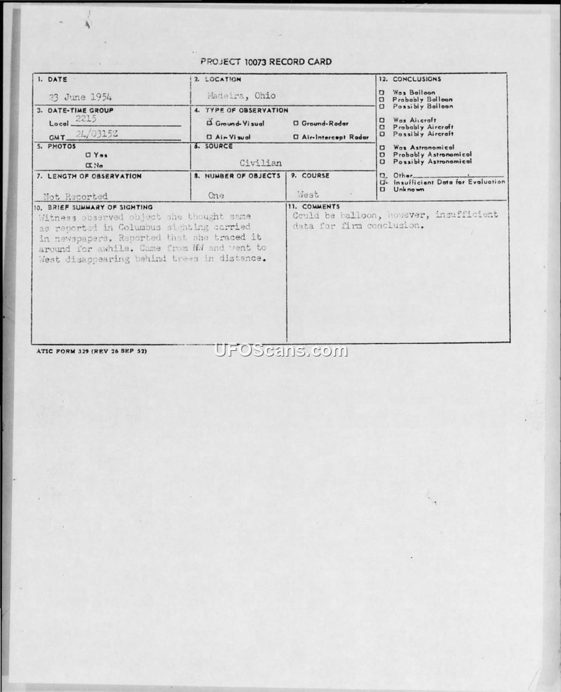 PROJECT 10073 RECORD CARD - Madeira, Ohio - 23 June 1954