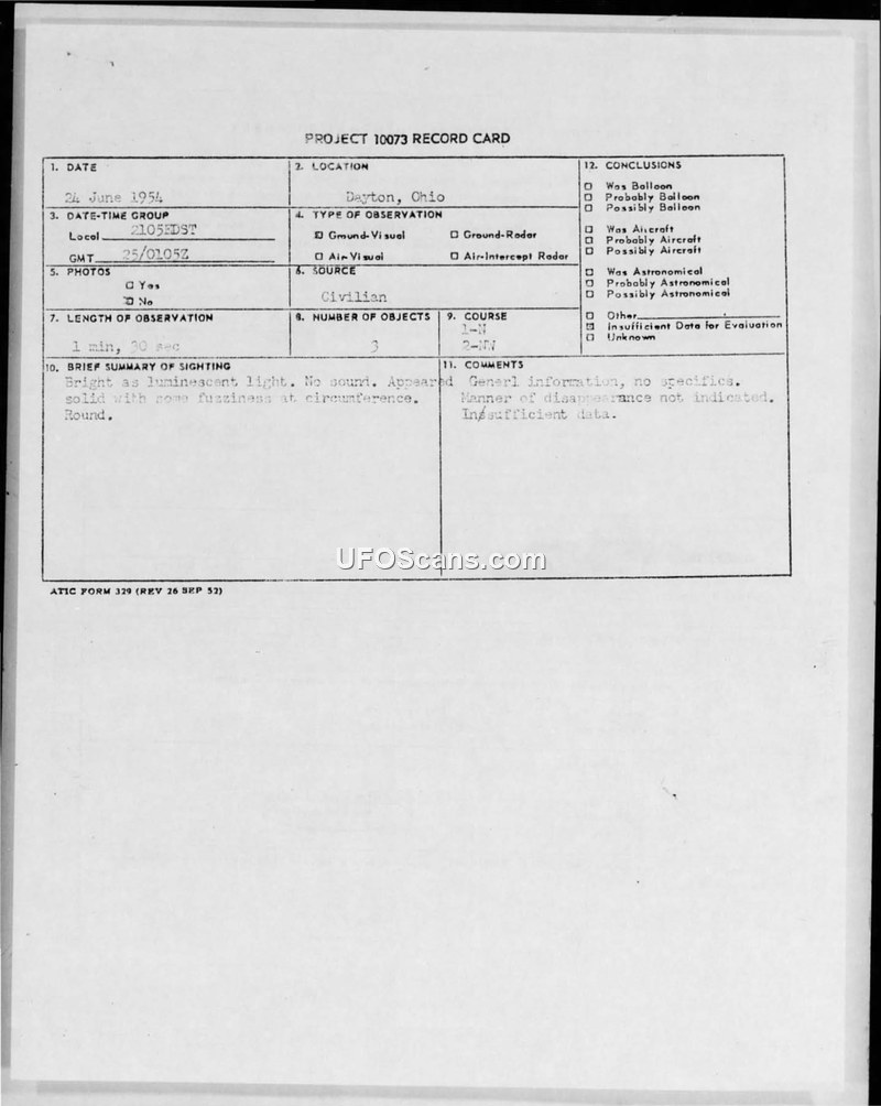 A civilian in Dayton, Ohio, reported sightings of luminescent, round objects on June 24, 1954. The Air Force concluded there was insufficient data to evaluate the incidents.