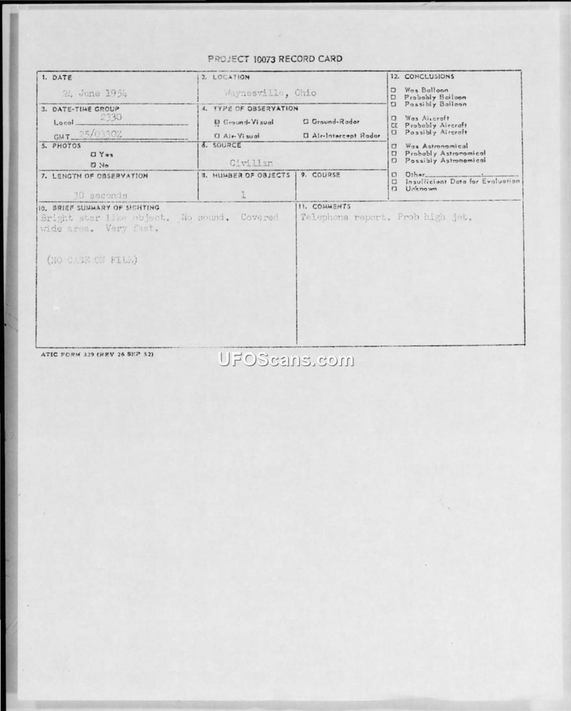Project 10073 Record Card — Waynesville, Ohio, 24 June 1954