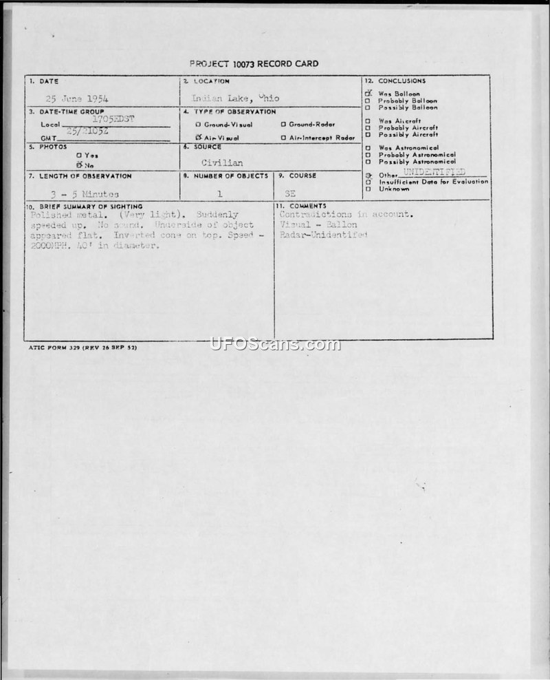 Project 10073 Record Card and Technical Information Sheets — Indian Lake, Ohio, 25 June 1954