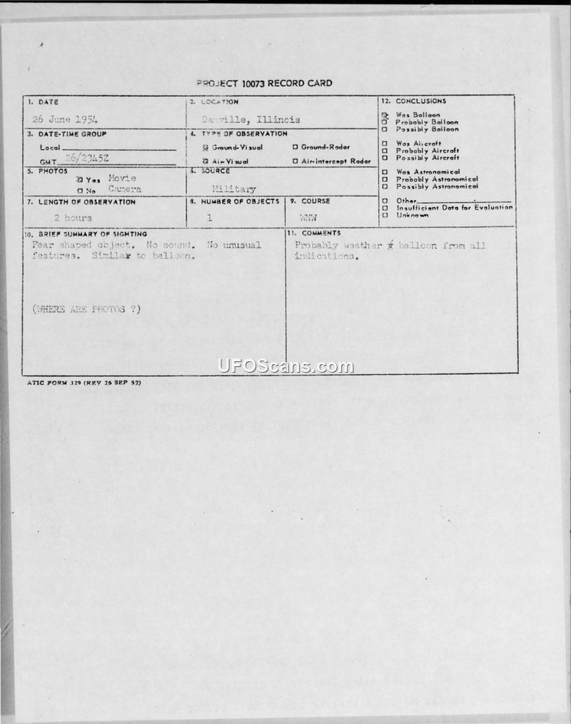 PROJECT 10073 RECORD CARD — Danville, Illinois, 26 June 1954