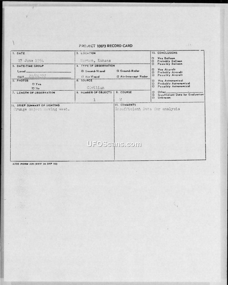 Project 10073 Record Card — Norton, Kansas, 27 June 1954