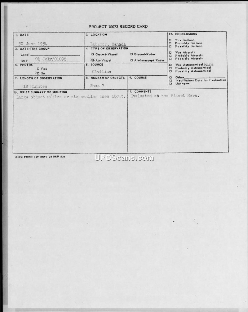 Project 10073 Record Card — Sighting of 30 June 1954, Labrador, Canada