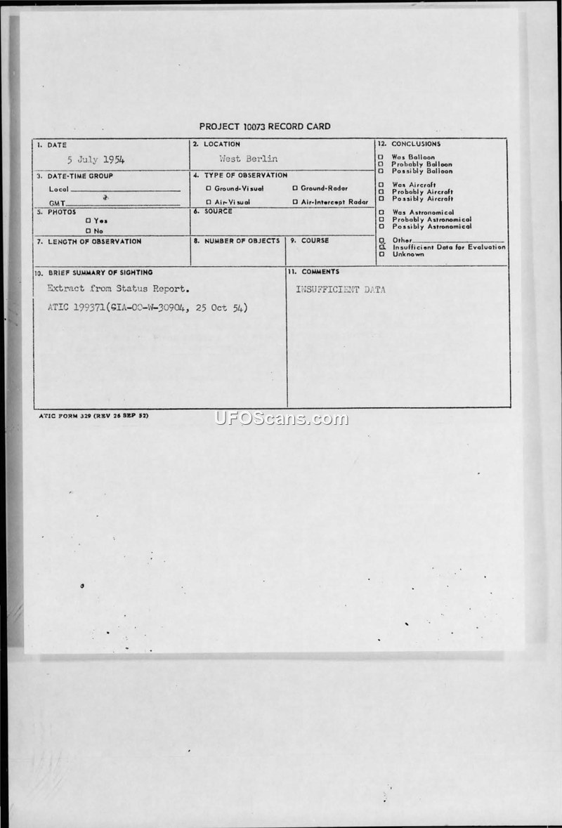 A Project 10073 record card for a July 5, 1954, sighting in West Berlin. The investigation concluded that there was insufficient data to evaluate the report.