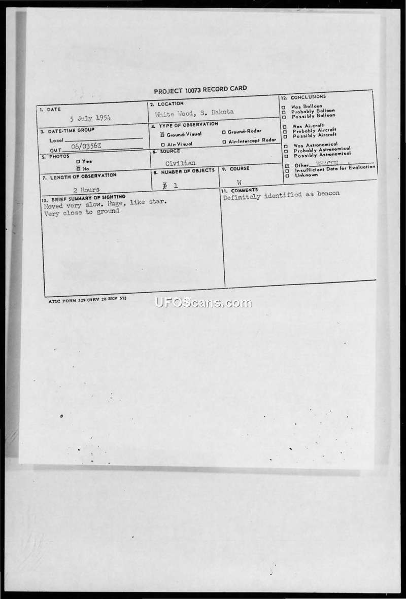 On July 5, 1954, at 0356Z, a sighting occurred over Whitewood, South Dakota, involving a large, star-like object that remained visible for approximately two hours. The object was described as moving very slowly and appearing very close to the ground. All residents of Whitewood reportedly witnessed the phenomenon. A military scramble was ordered by the 740th Aircraft Control and Warning Squadron, but the aircraft were unable to make contact with the object. Reports indicate that the object moved west from Whitewood toward Deadwood, South Dakota, and exhibited changes in intensity, shifting from dim to very bright while passing across low cloud formations. Filter center personnel also reported observing the object. Following the incident, the 740th ACW Squadron initiated the filing of Air Force Form 112s. Subsequent military correspondence dated July 8, 1954, provided a definitive conclusion regarding the sighting. The object was identified as a beacon located approximately 10 miles southwest of Rapid City, South Dakota. This conclusion was documented on the Project 10073 record card, which officially categorized the sighting as a beacon rather than an unidentified aerial phenomenon.