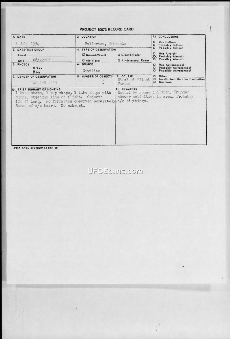 Project 10073 Record Card and Incident Report — Fullerton, Nebraska, 6 July 1954