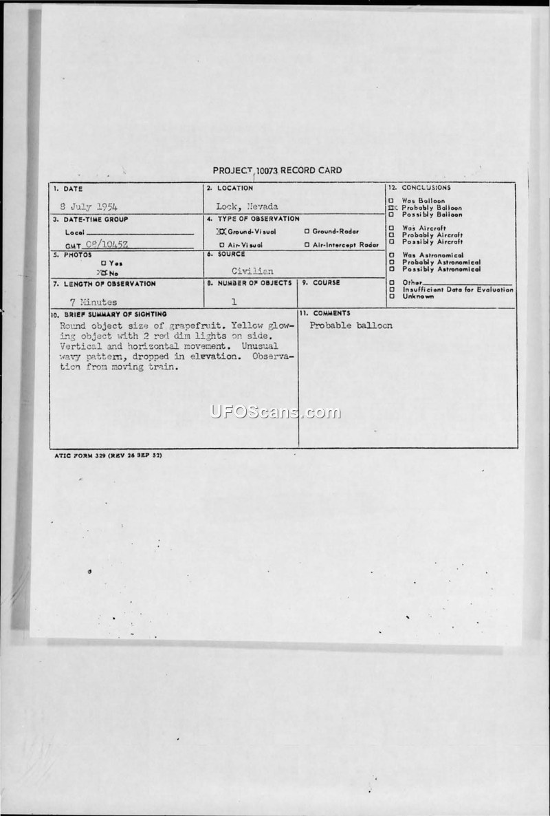 Project 10073 Record Card — Sighting near Lock, Nevada, 8 July 1954