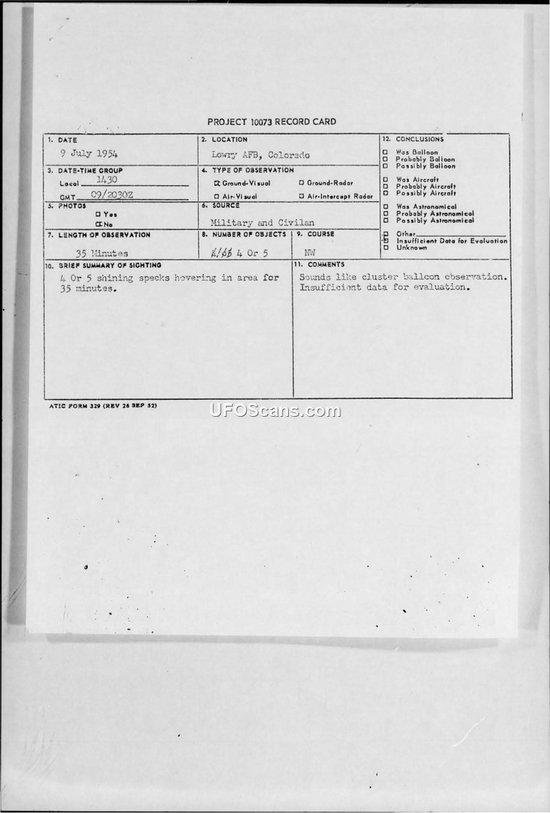 Project 10073 Record Card and Related Correspondence — Lowry AFB, Colorado, 9 July 1954