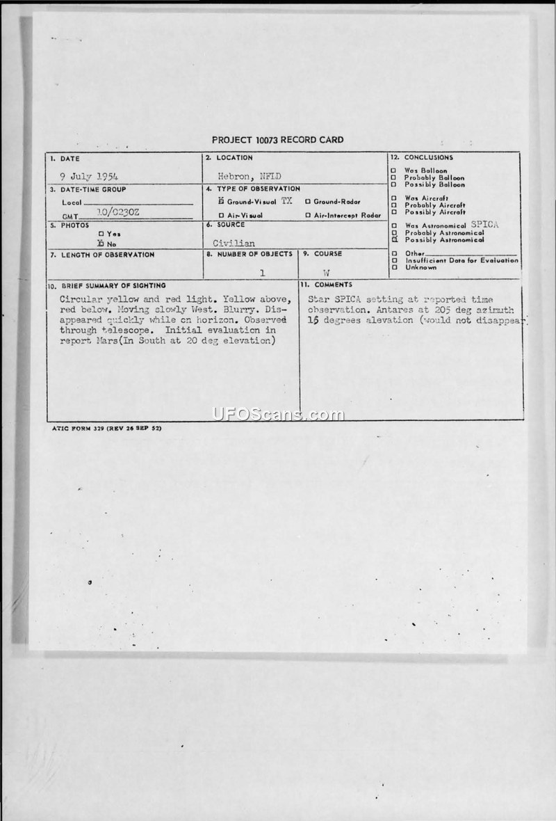 This document consists of a collection of military teletype messages and a Project 10073 record card documenting an Unidentified Aerial Phenomenon (UFOB) sighting near Hebron, Newfoundland, on July 9, 1954. The primary witness was a radio missionary named Grubb, who reported seeing a circular, yellow and red light in the sky approximately seven miles southwest of Hebron. The witness, who observed the object through a telescope, described it as moving slowly to the west before dropping suddenly behind a mountain, descending slightly, and then disappearing quickly. The witness noted that the tail of the object appeared blurry. The report was relayed through the 924th AC&W Squadron to the 64th Air Division and the Air Technical Intelligence Center (ATIC). Military authorities conducted a follow-up investigation, gathering details on the object's appearance, movement, and the conditions of the sighting. The initial evaluation by the 64th Air Division suggested the object might be the planet Mars, which was in the south at 20 degrees elevation at the time. Subsequent intelligence assessments and comments included in the file suggest that the star Spica was setting at the time of the observation, and that the sighting was likely an astronomical phenomenon. The documentation reflects the standard military procedure for reporting and evaluating potential aerial threats or anomalies during the 1950s, emphasizing the collection of witness testimony and the cross-referencing of astronomical data to rule out conventional explanations.