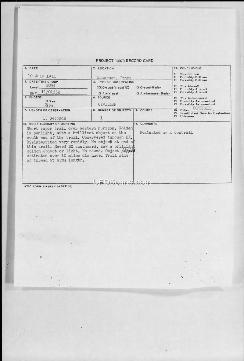 A civilian reported a golden object and vapor trail near Somerset, Pennsylvania, on July 10, 1954. The official military evaluation categorized the incident as a contrail.