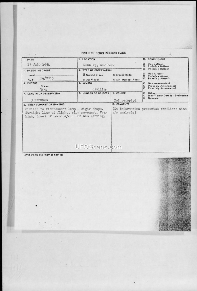 Project 10073 Record Card and Teletype Report — Newburgh, New York, 14 July 1954