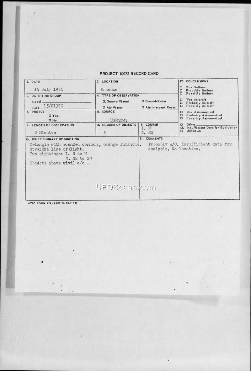 Project 10073 Record Card — 14 July 1954