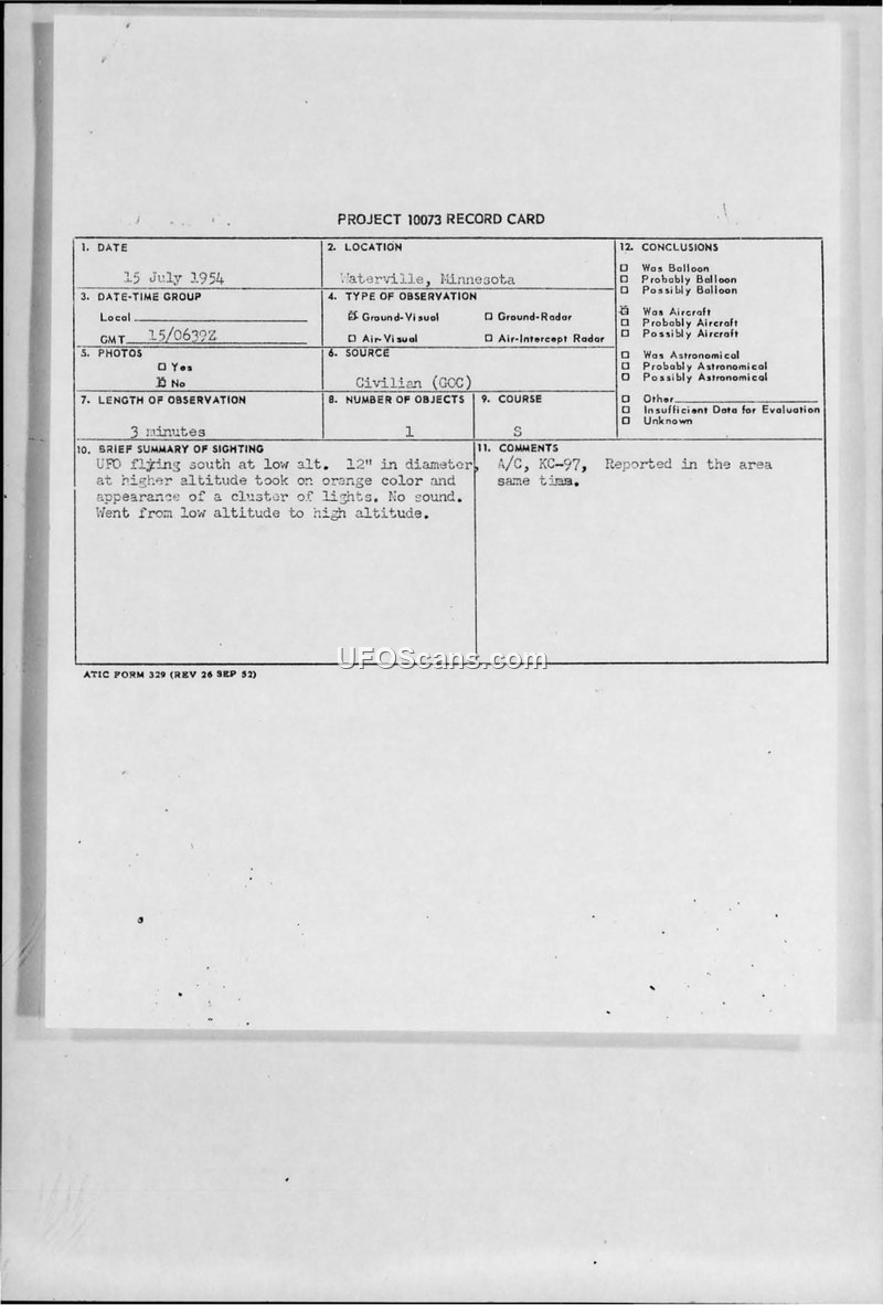 Project 10073 Record Card — Waterville, Minnesota, 15 July 1954