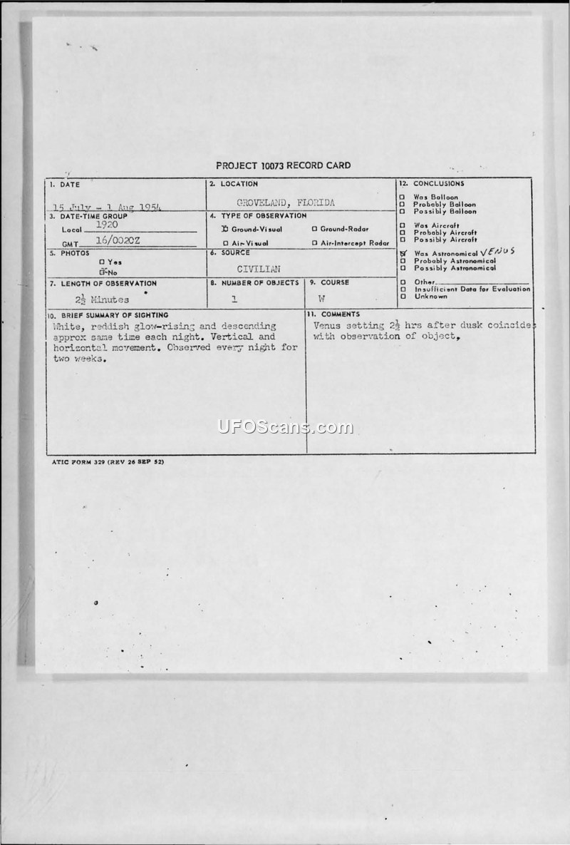 A series of sightings in Groveland, Florida, in July 1954 were investigated by the Air Force and officially attributed to the planet Venus. The report includes witness details and administrative correspondence regarding the handling of the sighting report.