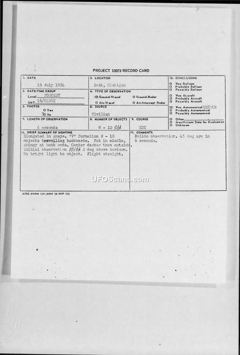 Project 10073 Record Card — Bath, Michigan, 15 July 1954