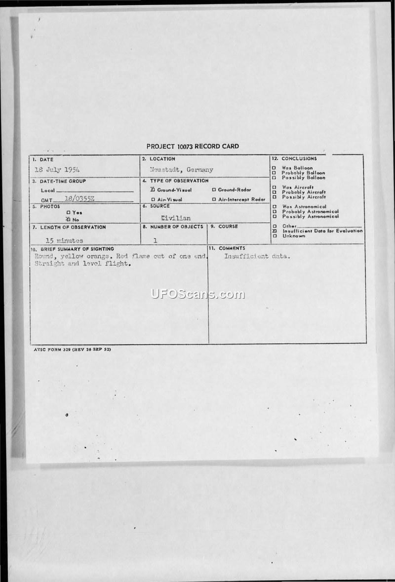 Project 10073 Record Card — Neustadt, Germany, 18 July 1954