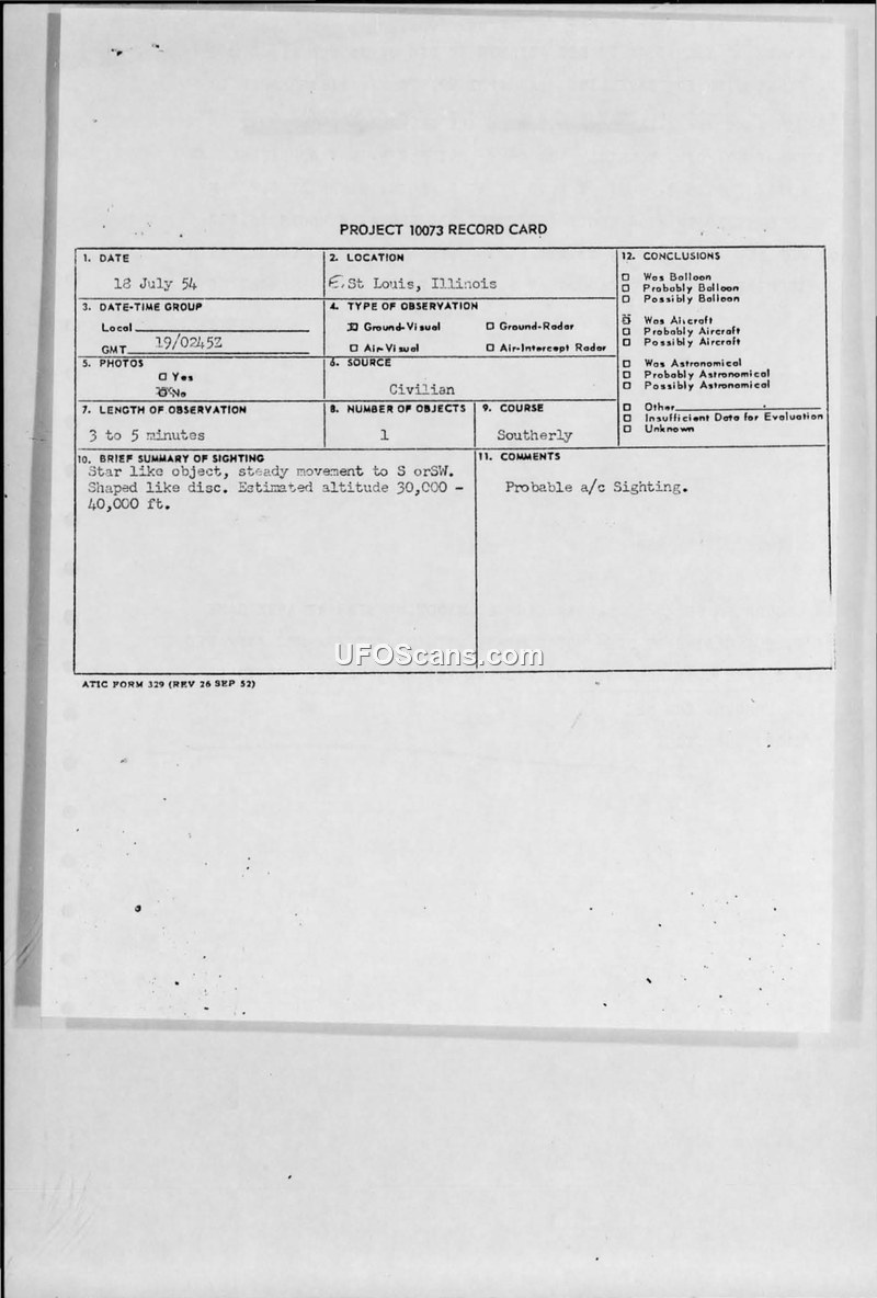 A 1954 report of two disc-shaped objects sighted over St. Louis, Illinois. The military concluded the sightings were likely aircraft or reflections on aircraft.