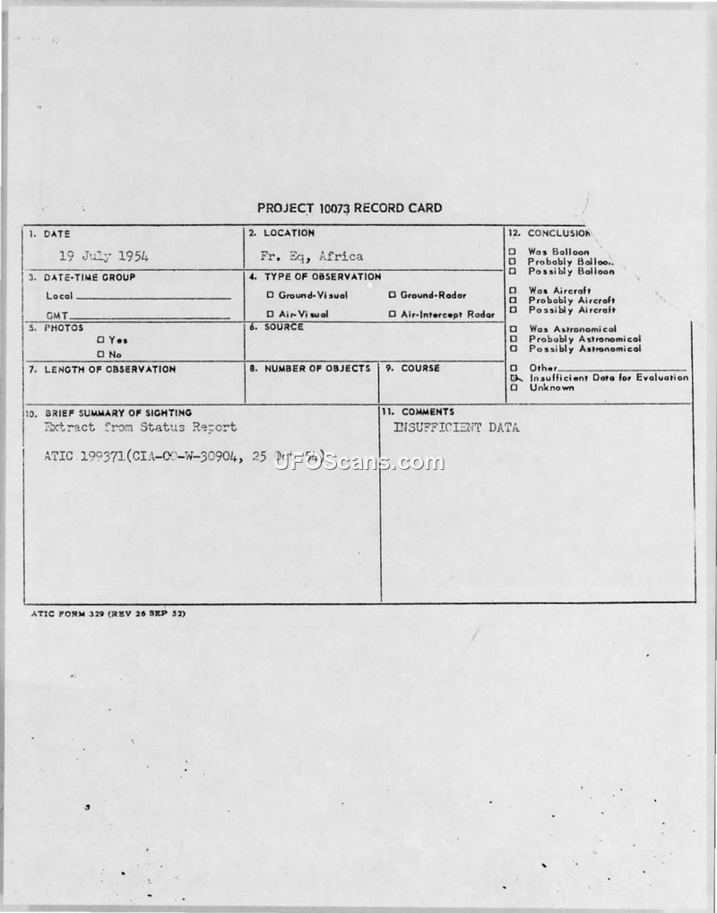 This document is a Project 10073 record card documenting a 1954 UFO sighting in French Equatorial Africa. The investigation concluded that there was insufficient data to perform an accurate analysis of the event.