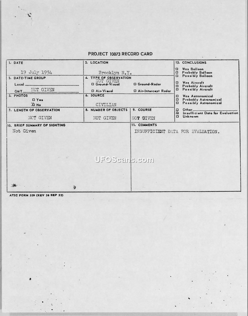 This document collection centers on a 1954 UFO sighting reported by a civilian, Main Kornberg, residing in Brooklyn, New York. The primary record is an ATIC Form 329, a Project 10073 record card, which categorizes the incident as having 'insufficient data for evaluation.' The file includes correspondence from 1959 between Kornberg, Professor J. Allen Hynek of the Smithsonian Astrophysical Observatory, and Major Lawrence J. Tacker of the United States Air Force. In his letter to Professor Hynek, Kornberg expresses frustration with the Air Force's administrative requirements, noting he had previously submitted a detailed report to Professor Menzel regarding his July 1954 sighting. Kornberg also raises broader concerns regarding the loss of space equipment, potential volcanic activity on the Moon, and the possibility of extraterrestrial bases. Major Tacker, responding on behalf of the Air Force, dismisses the notion of hostile UFO phenomena or interplanetary travel, while inviting Kornberg to provide further facts regarding his 1954 sighting if he believes it contradicts the official stance. The documents illustrate the bureaucratic process of handling civilian UFO reports during the late 1950s, highlighting the tension between civilian observers and the Air Force's dismissive official position.