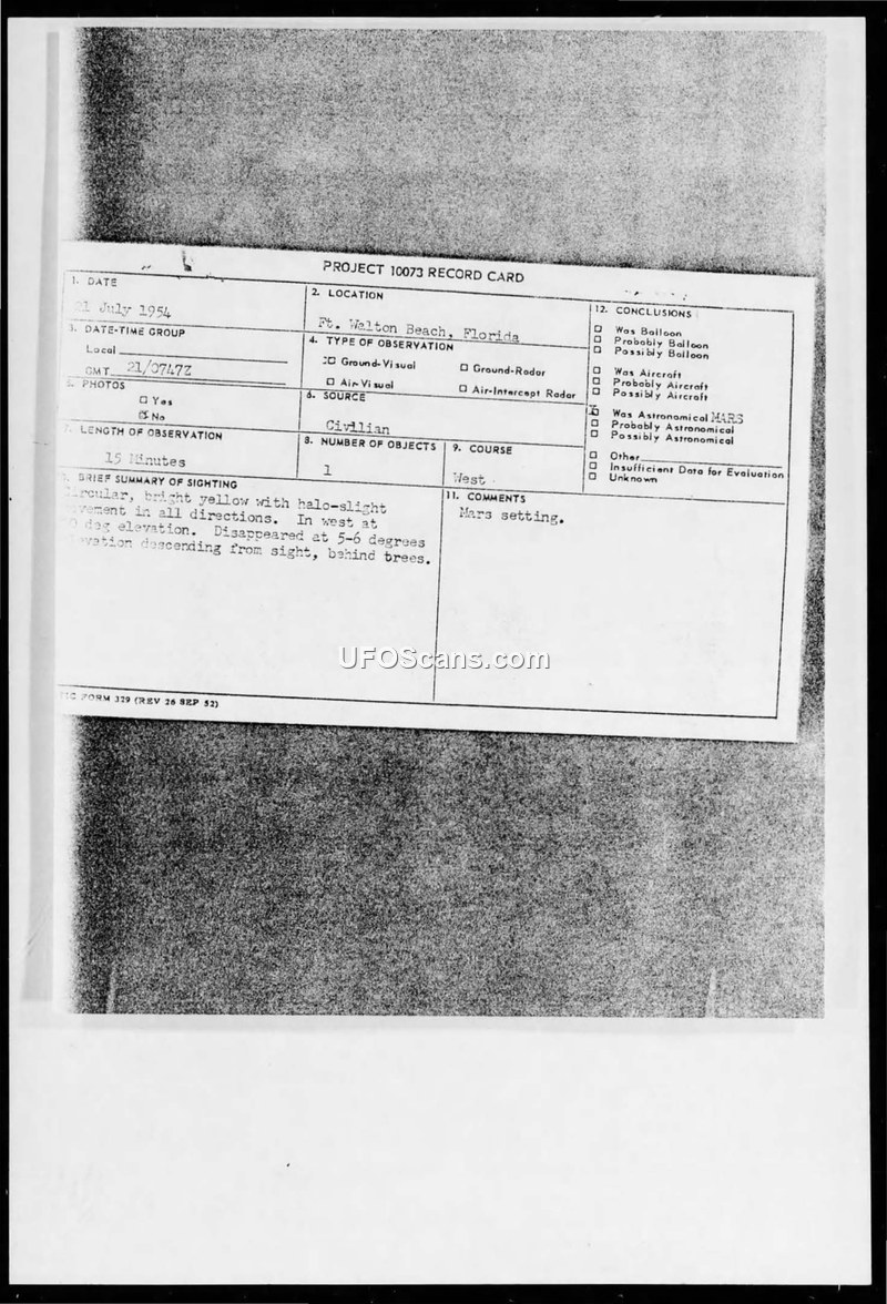 Project 10073 Record Card and Air Intelligence Information Report — Fort Walton Beach, Florida, 21 July 1954