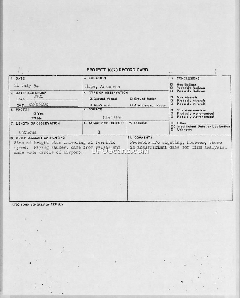 A report of a flying saucer sighting in Hope, Arkansas, on July 21, 1954, by a local attorney and his son. The Air Technical Intelligence Center concluded there was insufficient data for a firm analysis.