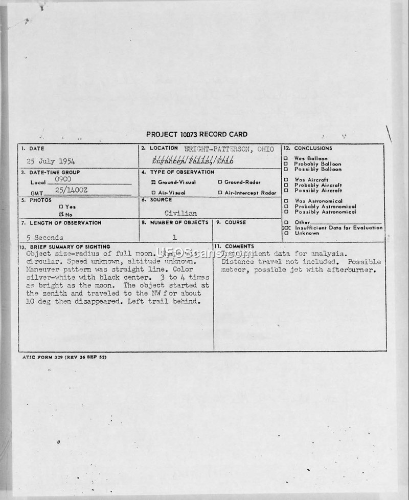 Project 10073 Record Card — Wright-Patterson, Ohio, 25 July 1954