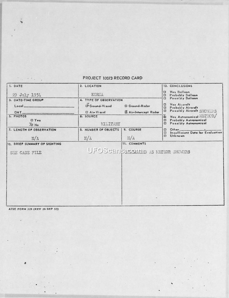 A Project 10073 record card documenting a July 29, 1954, sighting in Korea. The military report was officially evaluated as meteor showers.