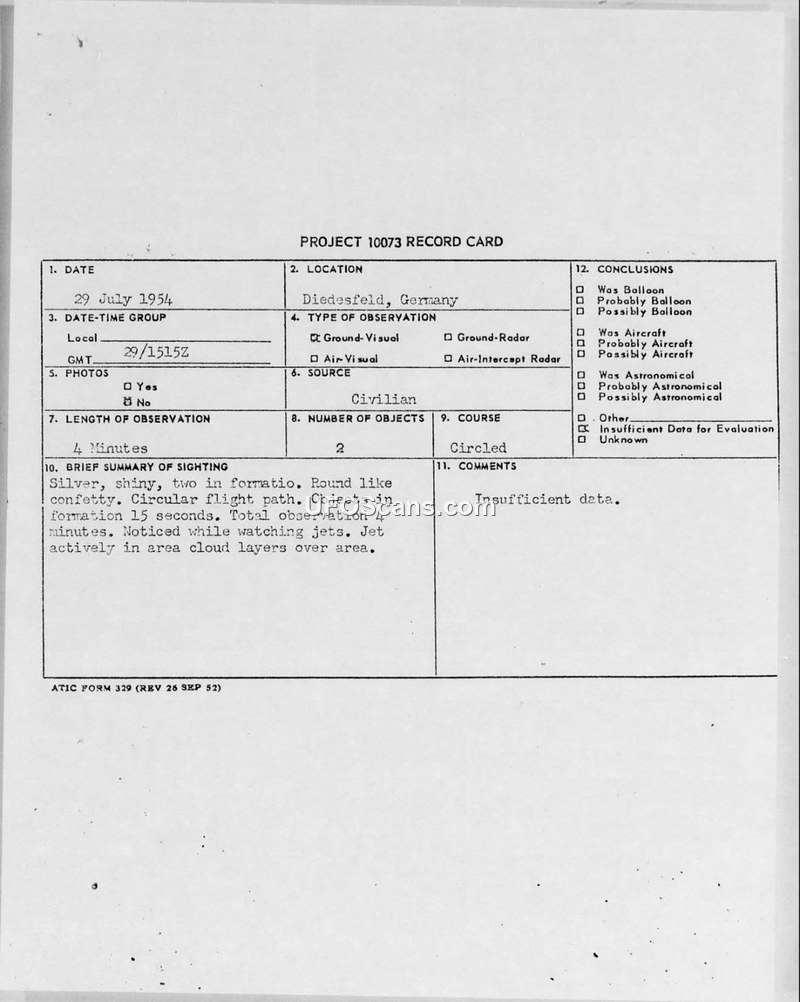 Project 10073 Record Card — Diedesfeld, Germany, 29 July 1954