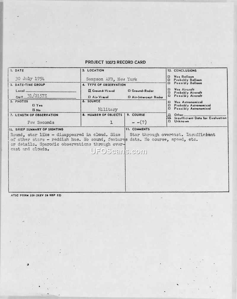 A 1954 report from Sampson AFB describes a star-like, reddish object observed through cloud cover. The investigation concluded there was insufficient data to identify the object.