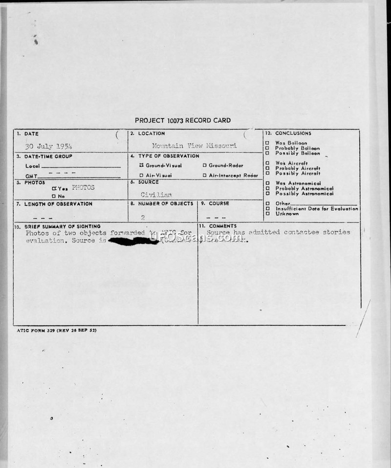 PROJECT 10073 RECORD CARD - Mountain View, Missouri - 30 July 1954
