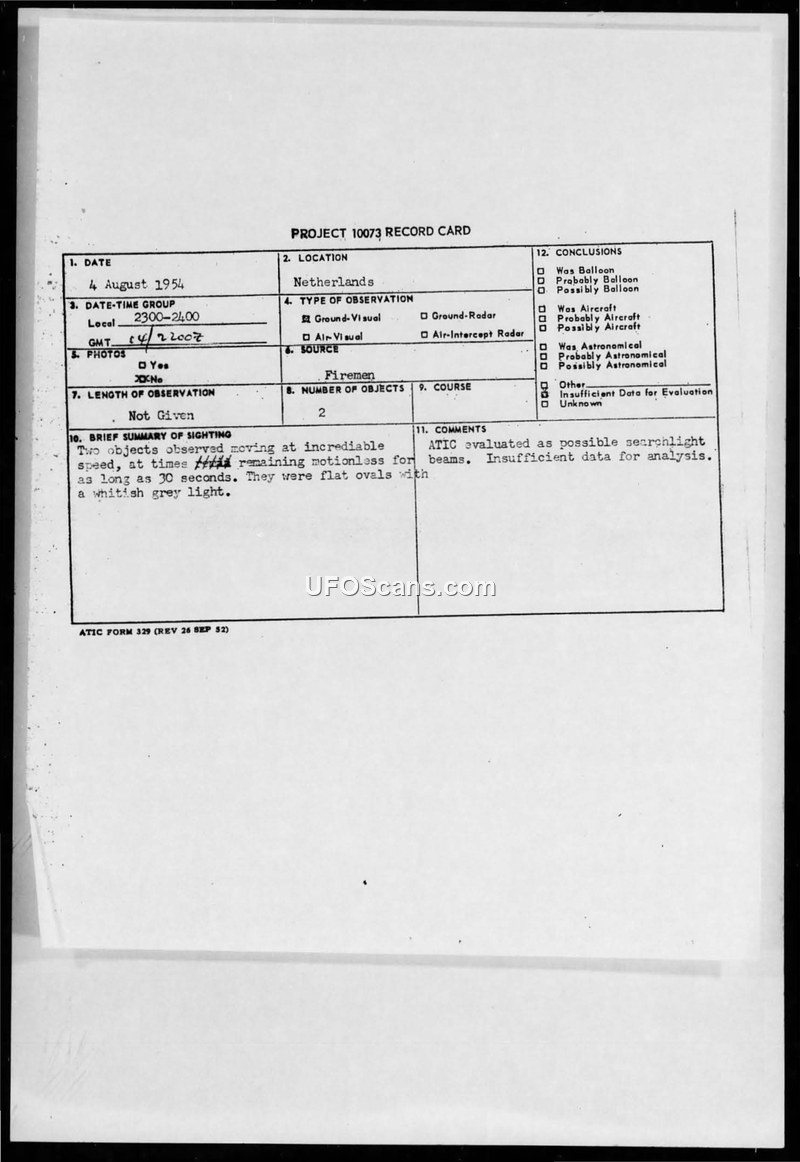 A Project 10073 record card documenting a 1954 sighting of two unidentified objects by firemen in The Hague. ATIC concluded the event had insufficient data for analysis, noting searchlight beams as a possible explanation.