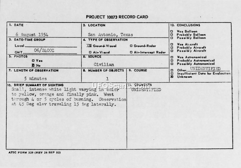 Project 10073 Record Cards and Air Intelligence Information Reports — San Antonio, Texas, August 1954
