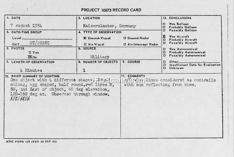PROJECT 10073 RECORD CARD — Kaiserslauten, Germany, 7 August 1954