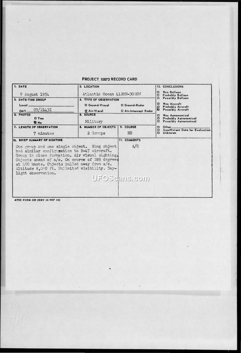 Project 10073 Record Card — Atlantic Ocean Sighting, 9 August 1954