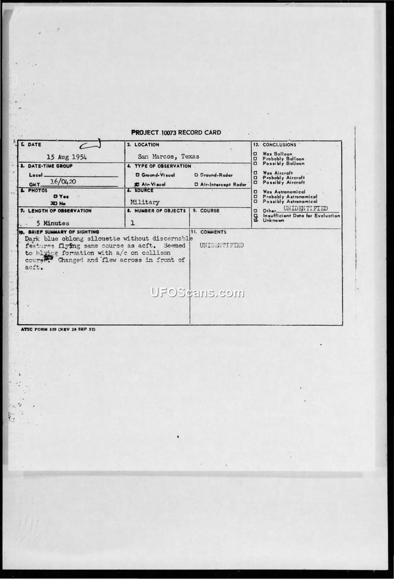 Project 10073 Record Card — San Marcos, Texas, 15 August 1954