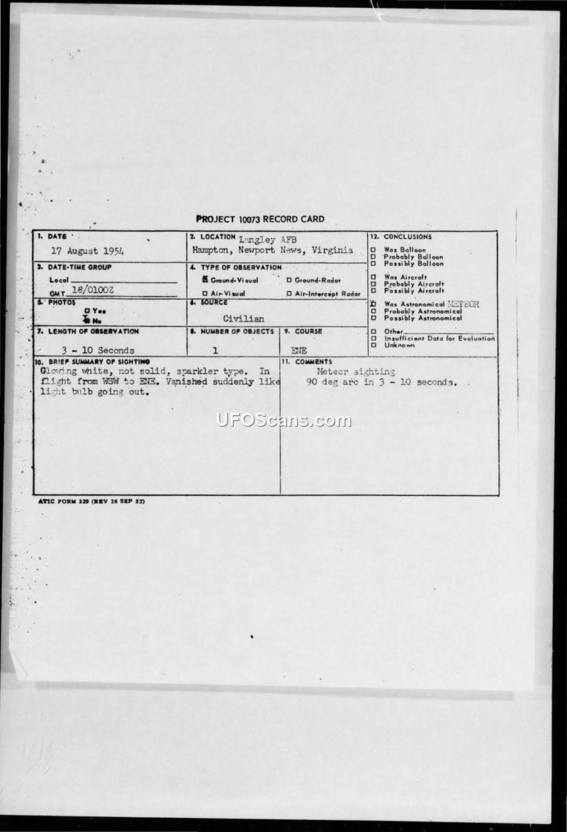 Project 10073 Record Card and Air Intelligence Information Report — Langley AFB, 17 August 1954