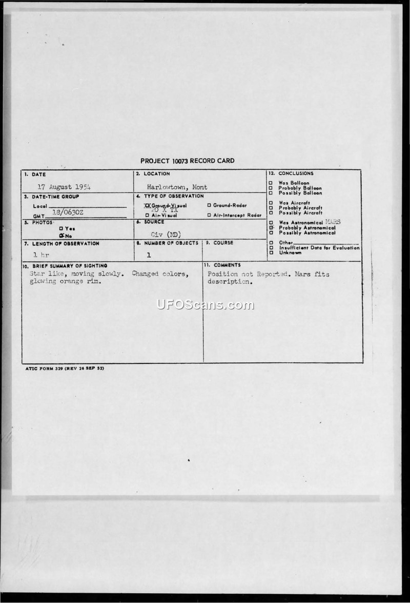 Project 10073 Record Card and Incident Report — Harlowton, Montana, 17 August 1954